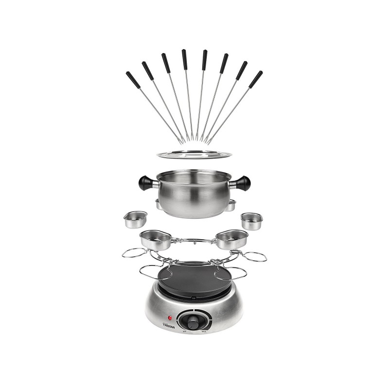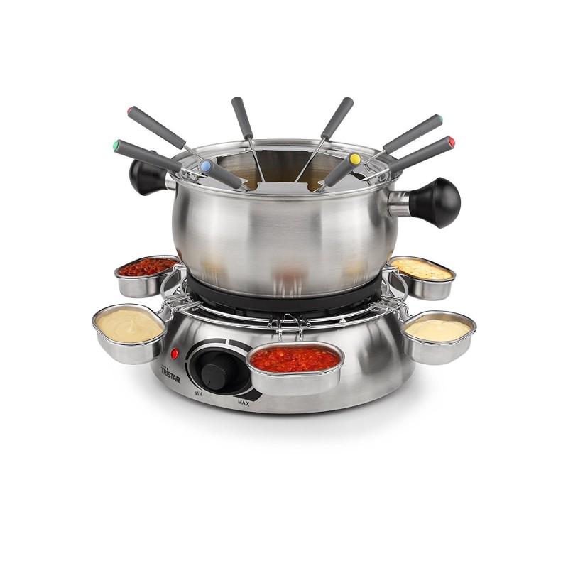 Capacité: 1 L , Thermostat règlable , Fonction de maintien au chaud , Convient pour 8 personnes , Corps résistant à la chaleur , Résistance cachée , Poignées intégrées , Indicateur de niveau maximum , Pièces compatibles lave-vaisselle , Corps inox , Témoin lumineux de fonctionnement , Puissance: 1300 Watts , Plateau tournant avec coupelles à sauces , 8 Fourchettes inox , Pieds anti-dérapants, Rangement du cordon